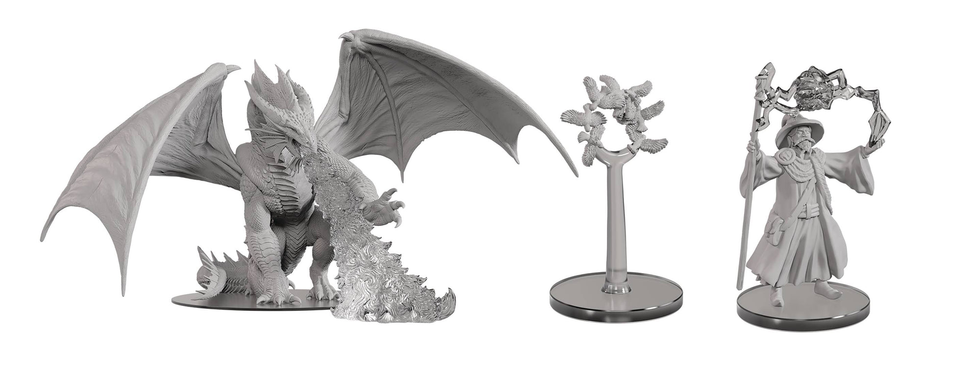 Bahamut, the patron and progenitor of metallic dragons, displays his full glory as the Platinum Dragon, towering over most dragons. Sitting at over 12 inches tall with a wingspan of 22 inches, Bahamut is ready to wreak monumental destruction with his Platinum Fire breath. Bahamut can often be found in his mortal disguise, known as Fizban the Fabulous, accompanied by 7 ancient gold dragons who favor disguising themselves as canaries. Contents: 1 unpainted Gargantuan Bahamut miniature on 200 mm base, 1 unpainted Detachable Platinum Fire Breath Weapon, 1 unpainted Fizban the Fabulous miniature (Medium figure on 25mm base), 1 unpainted Swarm of Canaries miniature (Medium figure on 25mm base).Â