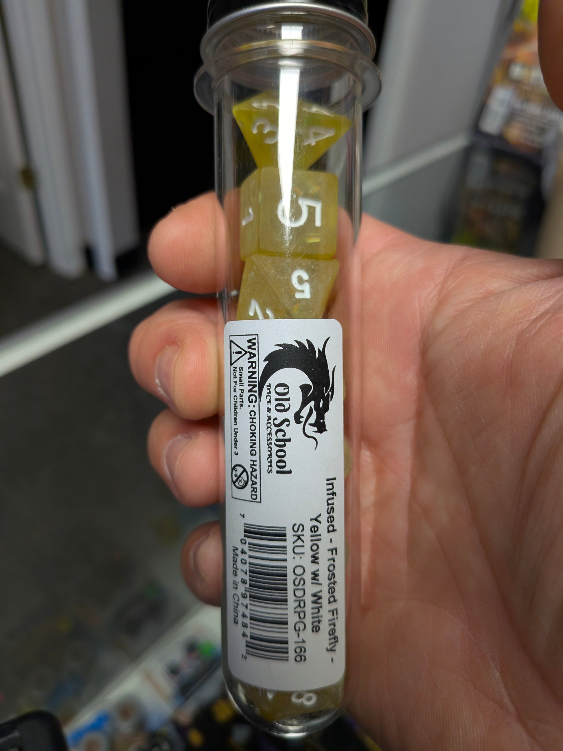 Old School 7 Piece DnD RPG Dice Set: Pearl Drop - Infused Frosted Firefly Yellow w/White